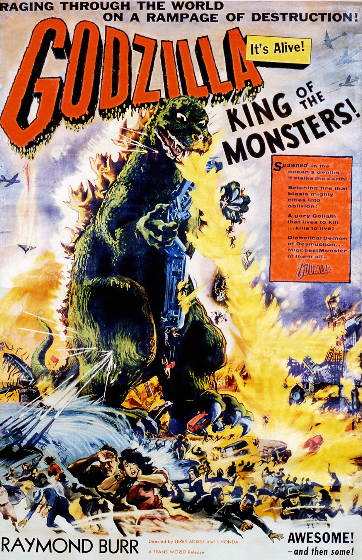 Now, I do want to take some time to talk VERY briefly about Godzilla: King of the Monsters! No, not the upcoming film. Although, don't worry. I'll get there soon enough. No, I want to talk about the American rerelease of the original Godzilla, a film called Godzilla: King of the Monsters! that the upcoming film borrows its title from, okay? Alright, with that stupid title debacle out of the way: here's the thing. This is not the same movie. Godzilla: King of the Monsters! and Godzilla are two very different films. I mean, for one big difference, you just gotta look at the poster. Notice anything odd? Well, you'll notice a few things, but the single most important thing to point out is that this movie "stars" Raymond Burr. Burr is a great actor, and I love a lot of his body of work. From Rear Window to even a reappearance of him we'll see later, Burr is a great actor. But this is not the movie for him. Which might seem weird. I mean, he was a villain in Rear Window, a film famous for its suspense and ability to keep an audience on the edge of their seats. And if Burr was in Godzilla, he might have fit. But his great voice is wasted here as he basically just narrates the whole movie and can almost feel demeaning for the audience. But that's not the big issue here. The problem with King of the Monsters! is that it was not edited or made in a way to be a horror film like the original cut is. It was made, edited and advertised in a way for audiences to watch it and feel like they were watching a new King Kong. And though I love King Kong, they aren't anywhere close to the same movie. One is a spectacle, the other is a critical think piece for modern society, and it was made out as if it was supposed to be just another spectacle. I mean, the movie was advertised with the line "Dynamic action! Thrilling violence," after all. When the "action and violence" in the original cut are played for horror and audience discomfort. This movie really is an honest bastardization of the original film. Which really sucks, because until Godzilla got his star on the Hollywood Walk of Fame in 2004, this was the only version of this movie to exist in the States. So, with the original readily available for viewing through the Criterion Collection, I can say beyond a shadow of a doubt: buy that release of the film, watch the original, and don't even bother thinking about King of the Monsters! ------------------------------------------------------------------------------------------------------------------------------------------------------------------------------------